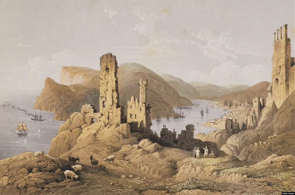 Карло Боссолі був італо-швейцарським художником, відомим своїми детальними пейзажами та батальними сценами. Робота зображує місто та гавань Севастополя, стратегічного чорноморського порту. Боссолі створив серію літографій на основі своїх подорожей Кримом у 1840-х роках. Зображення зображує Севастополь невдовзі після Кримської війни, яка завершилася в 1856 році, та показує руйнування від облоги, що тривала з жовтня 1854 року по вересень 1855 року.