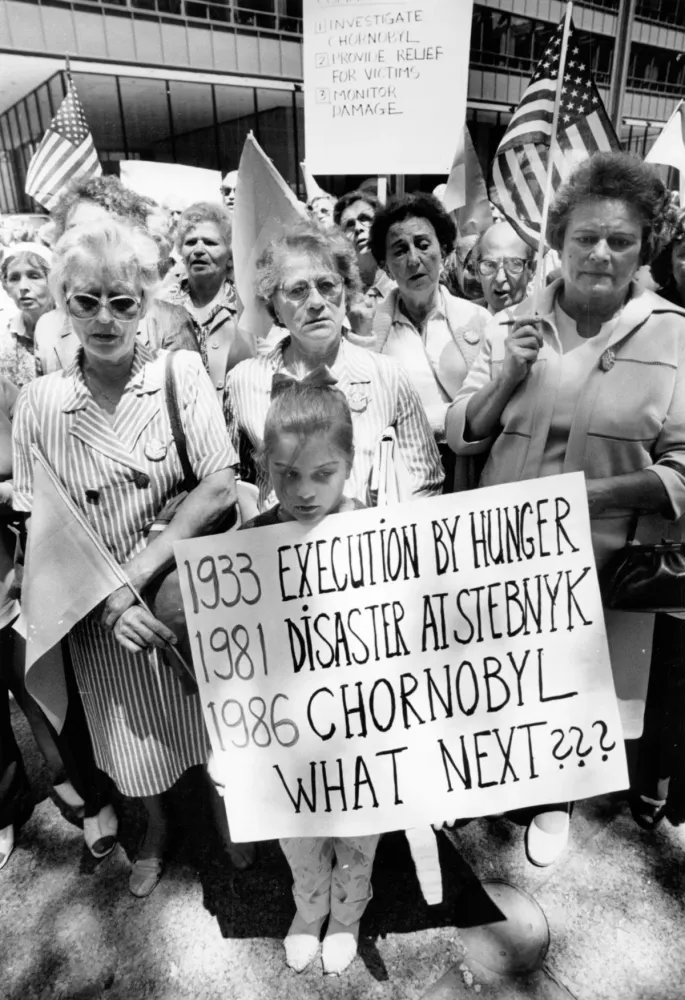 Ruslana Zavadovych, 8, displays a sign citing infamous incidents in Ukrainian history, including the Chernobyl nuclear plant disaster and Holodomor, at a Daley Plaza rally on June 9, 1986. The anti-Soviet protest was sponsored by the Ukrainian Congress Committee.