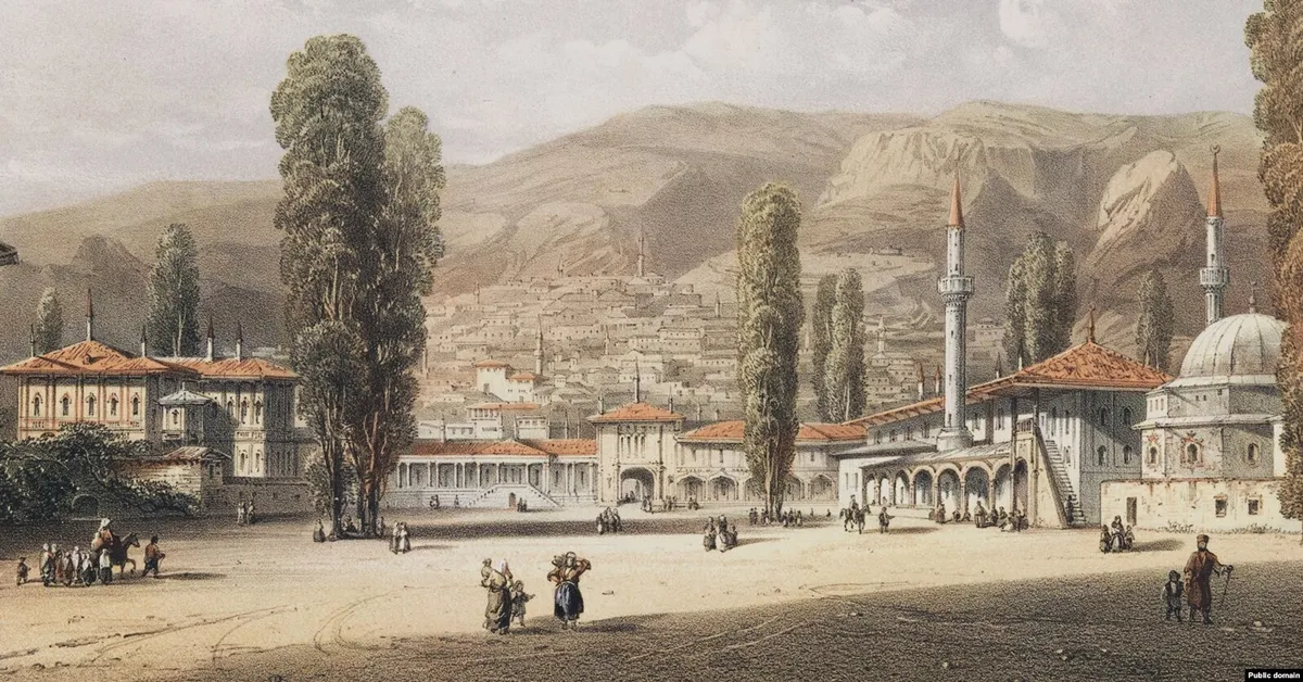 На картині зображено Бахчисарайський палац (також відомий як Ханський палац або Гансарай) – архітектурний комплекс XVI століття, який служив резиденцією низки кримських ханів. Побудований у 1532 році Сахібом I Гіреєм, він вважається єдиним збереженим зразком кримськотатарської палацової архітектури у світі. Палацовий комплекс був побудований у поєднанні османського, перського та італійського архітектурних стилів. Спочатку він включав мечеть, гарем, цвинтар, житлові приміщення та сади.