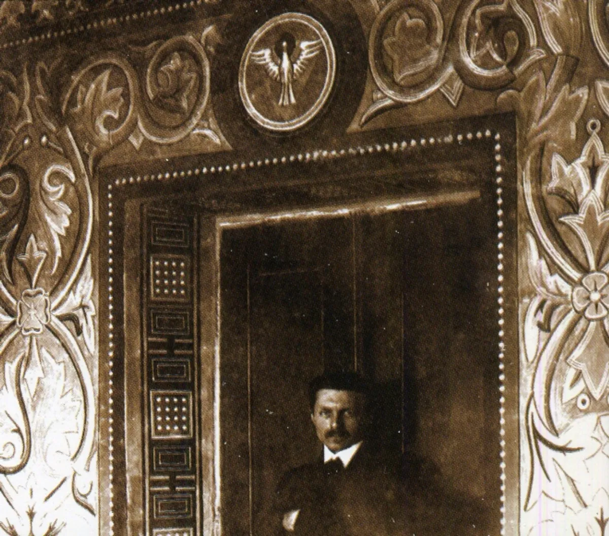 Михайло Бойчук на тлі невідомого монументального мурала