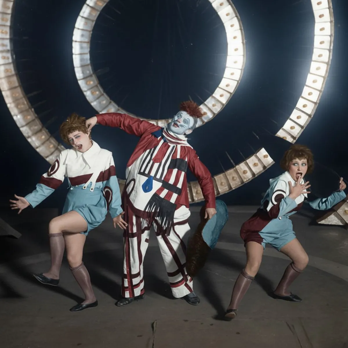 Михайло Бойчук на тлі живописної композиції «Свято врожаю» (розписи не збереглися) для Харківського червонозаводського театру