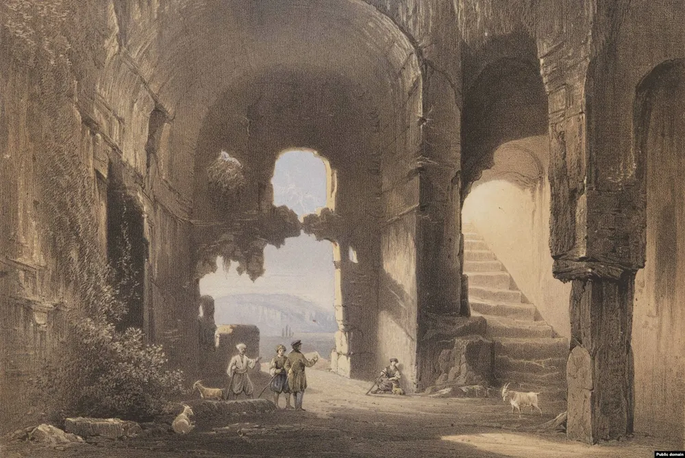Інкерманський печерний монастир — це печерний монастир, розташований у скелі поблизу гирла річки Чорна в Севастополі, Крим. Монастир був заснований приблизно у VI столітті. На зображенні зображено групу людей та кіз у печерах, а також краєвид зовні через арки. Монастир був закритий у 1931 році та знову відкритий у 1991 році, і наразі він окупований так званою російською федерацією.
