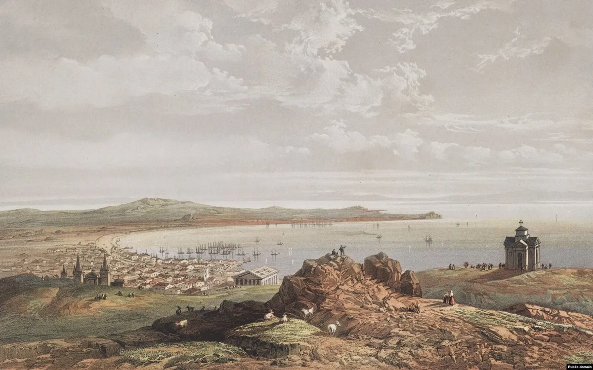 На картині зображено панорамний вид на Керченську затоку та місто Керч, розташоване на Кримському півострові, з вершини гори Мітрідат. Сцена включає місто з його гаванню та кораблями, церковно-подібну споруду на схилі пагорба та кілька фігур з вівцями на передньому плані.