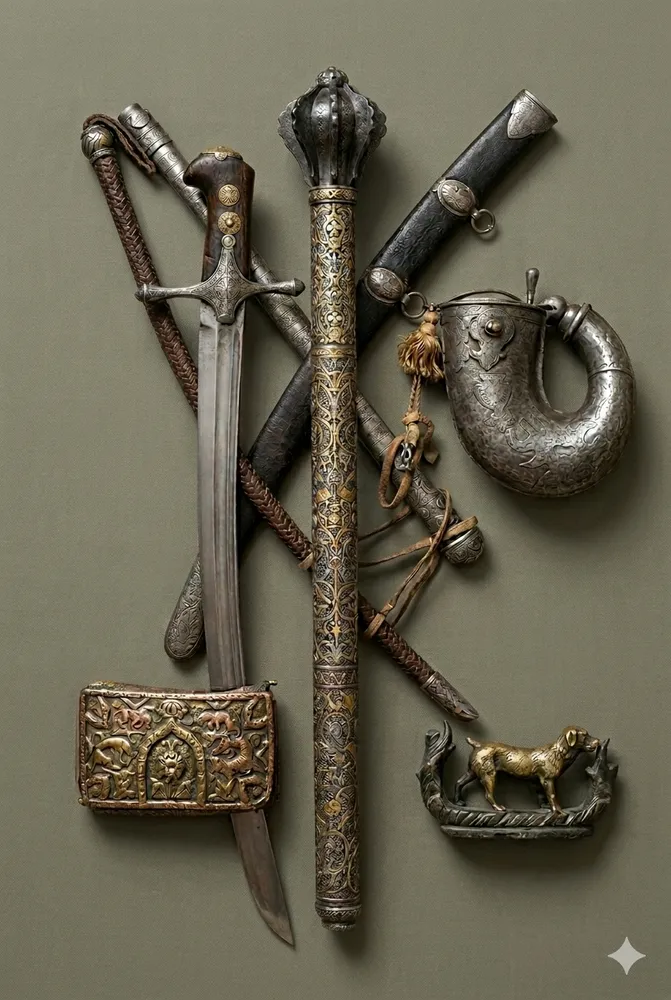 Козацька зброя: Пернач, шабля, порохівница, два кресала, нагайка.
