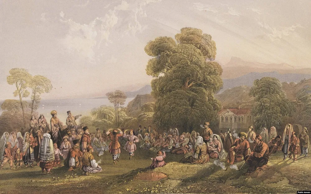 На картині зображено святкування з кримськими татарами в Масандрі, Крим. У сцені зображено людей, які танцюють та збираються в сільській місцевості з великим деревом у центрі, горами та водоймою на задньому плані. Фігури одягнені в традиційний одяг. Деякі активно танцюють у колі, інші сидять і спостерігають за подією.