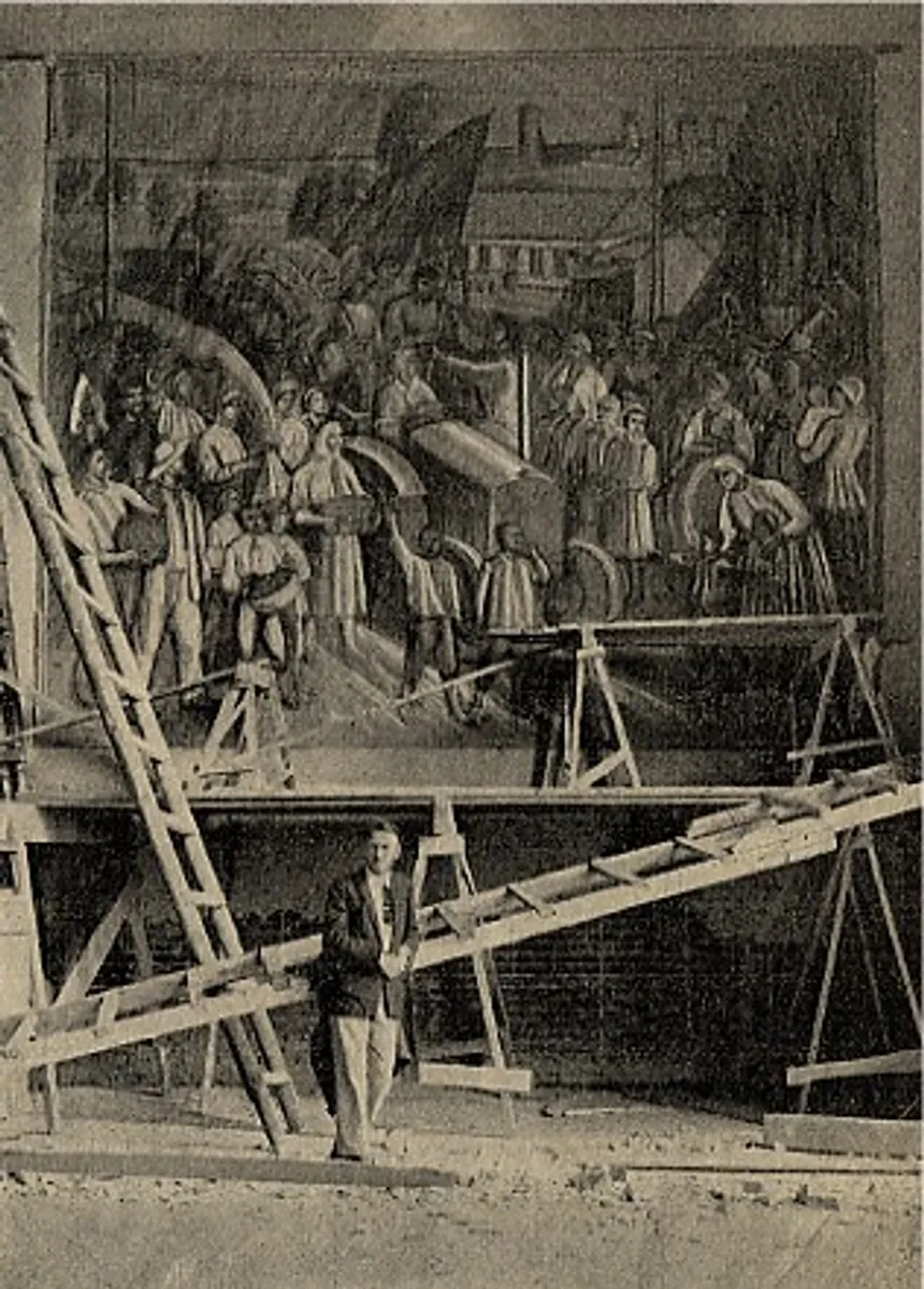 Михайло Бойчук на тлі невідомого монументального мурала