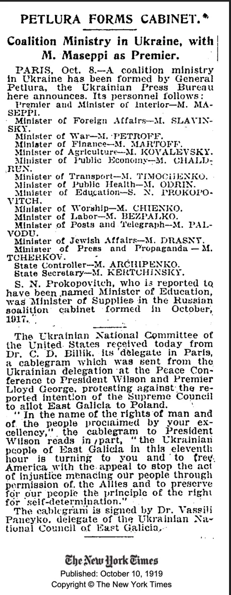 Український Національний Комітет Сполучених Штатів отримав повідомлення від д-ра К. Д. Білліка, українського делегата в Парижі, в якому він протестує проти повідомлення про намір Верховної Ради передати Східну Галичину Польщі. У повідомленні зазначається, що український народ Східної Галичини має таке ж право визначати свою долю, як і поляки, і закликається до Америки підтримати ці права. Підпис: д-р Василь Панейко, делегат Української Національної Ради Східної Галичини. Опубліковано: 10 жовтня 1919 р. The New York Times