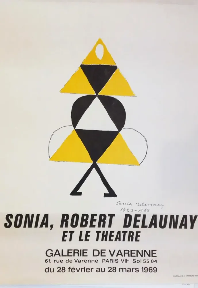 «Соня, Робер Делоне та театр», плакат виставки, галерея «Варенн», Париж, 1969. Видавництво Жака Дамаза. Літографія, надрукована видавництвом «Арт Літо», Париж. Мотив «Жовта танцівниця» за мотивами дизайну костюмів до п'єси «Серце газу» Трістана Тцари, поставленої в Парижі в 1923 році. Фото: Galerie Modernes.