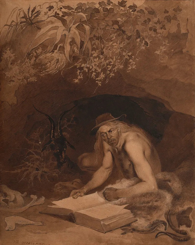Цей малюнок є ілюстрацією літературного персонажа Робінзона Крузо, створеного в 1856 році українським художником і письменником Тарасом Шевченком. Твір виконано на папері з використанням сепії та бістру та є частиною колекції Національного музею Тараса Шевченка в Києві, Україна. Шевченко був відомий тим, що високо цінував Даніеля Дефо та його роман «Робінзон Крузо», і навіть радив дітям і дорослим прочитати цю книгу. На малюнку зображено Крузо з довгим волоссям і капелюхом, який сидить у печері та читає книгу. Позаду нього видно козу. Твір був створений під час заслання Шевченка, періоду, коли йому було заборонено писати чи малювати. Художник був видатною діячом українського національного відродження.