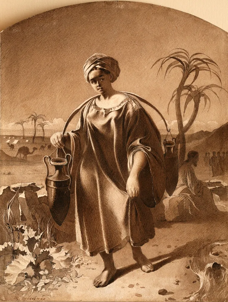 Малюнок зображує біблійну сцену з Євангелія від Івана, де Ісус зустрічає самарянку біля криниці. На зображенні жінка на передньому плані, тримаючи глечик на ярмі, а на задньому плані Ісус розмовляє з групою людей. Зустріч була значною, оскільки євреї та самаряни традиційно були ворогами, але Ісус, розмовляючи з нею, виявляв співчуття та можливість спасіння. Робота Шевченка є частиною серії алегоричних малюнків, які він завершив під час свого заслання.