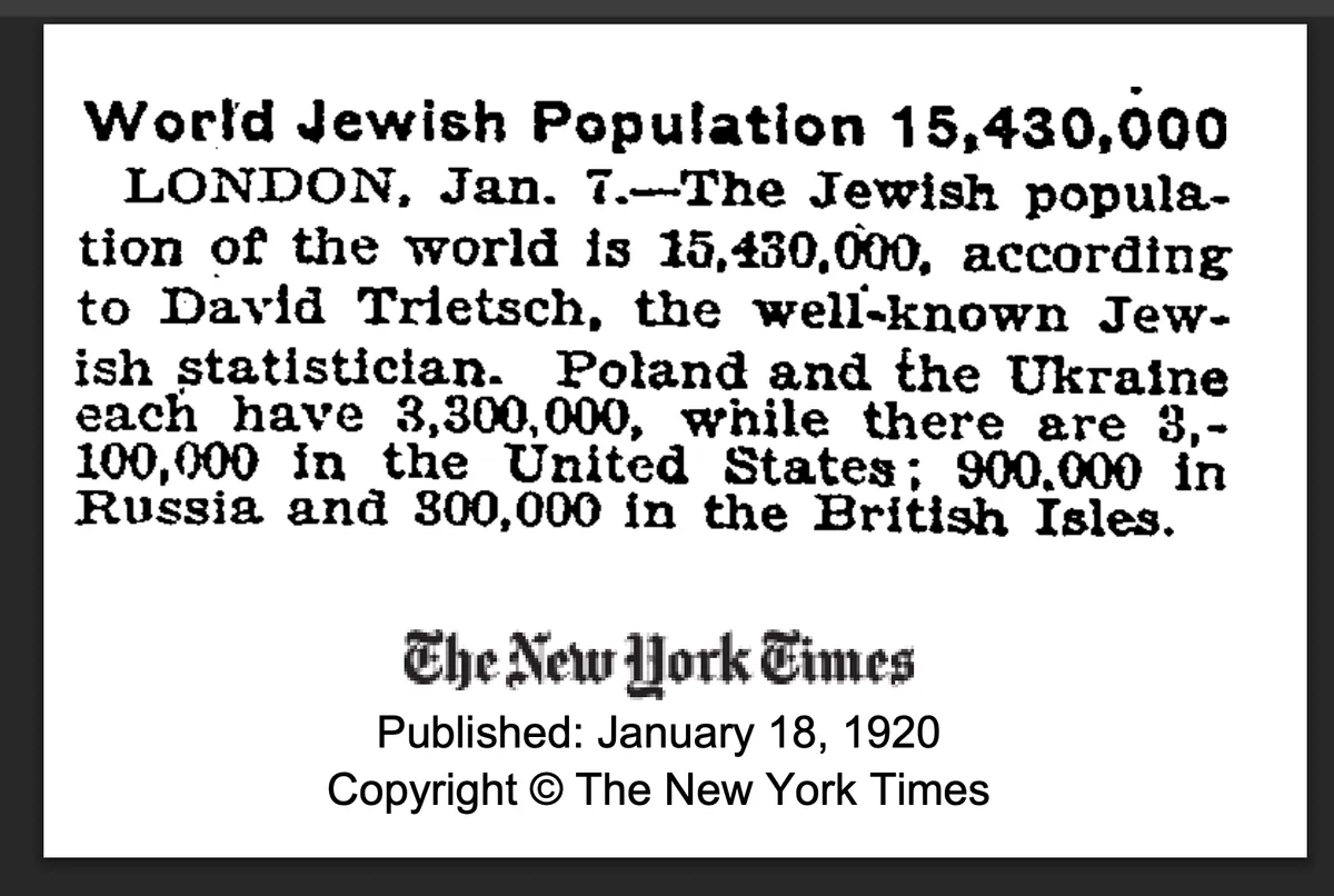 ЛОНДОН, 7 січня. — За даними відомого єврейського статистика Девіда Трітча, єврейське населення світу становить 15 430 000 осіб. У Польщі та Україні проживає по 3 300 000 євреїв; у Сполучених Штатах — 3 100 000; у росії — 900 000, а на Британських островах — 300 000. Опубліковано: 18 січня 1920 року Авторське право © The New York Times