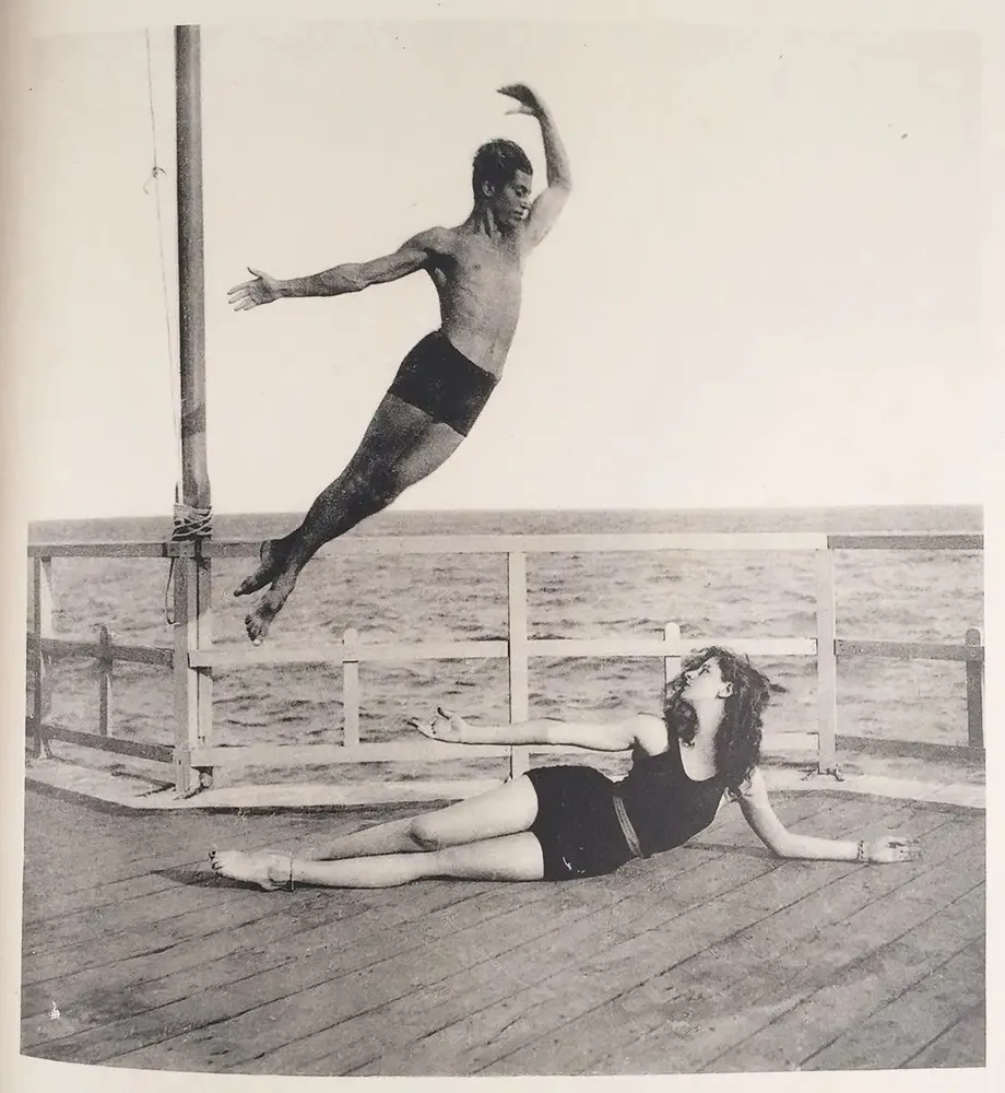 На зображенні танцюрист і хореограф Серж Лифар виконує стрибок, який називають «елевацією», а танцівниця лежить на палубі чогось, схожого на корабель. Фотографія була опублікована в книзі 1934 року «Destin d'un Danseur».