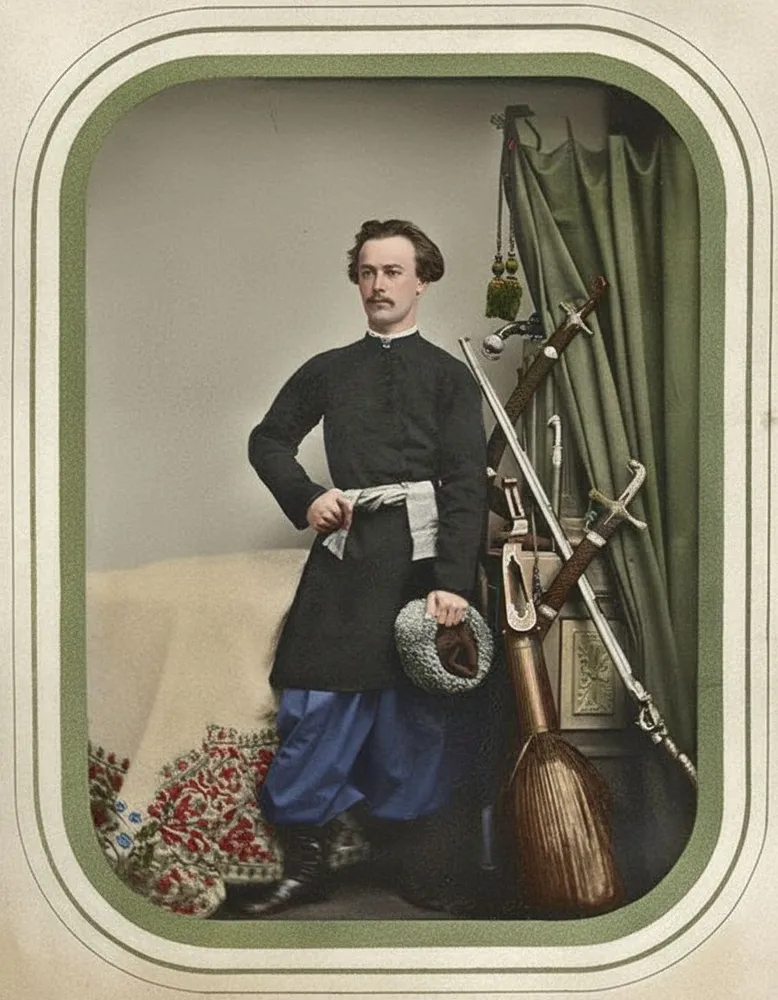 Живе відлуння козацької еліти: Георгій Нарбут у «Контусі» Параски Апостол з Келепом та полковником МілорадовичемНа фотографії Георгій Нарбут стоїть у козацькій залі музею Тарновського (нині кімната Чернігівської обласної бібліотеки для юнацтва), повністю занурений в історичний український образ. Він одягнений у кунтуш Параски Апостол, дочки гетьмана Данила Апостола, тримаючи в правій руці келеп, а праворуч від нього стоїть полковник Михайло «Гармата» Милорадович. Ця постановочна, але водночас документальна сцена показує Нарбута, який не просто вивчає артефакти козацької доби, а буквально носить їх, перетворюючи себе на живе втілення українського дворянсько-козацького минулого.