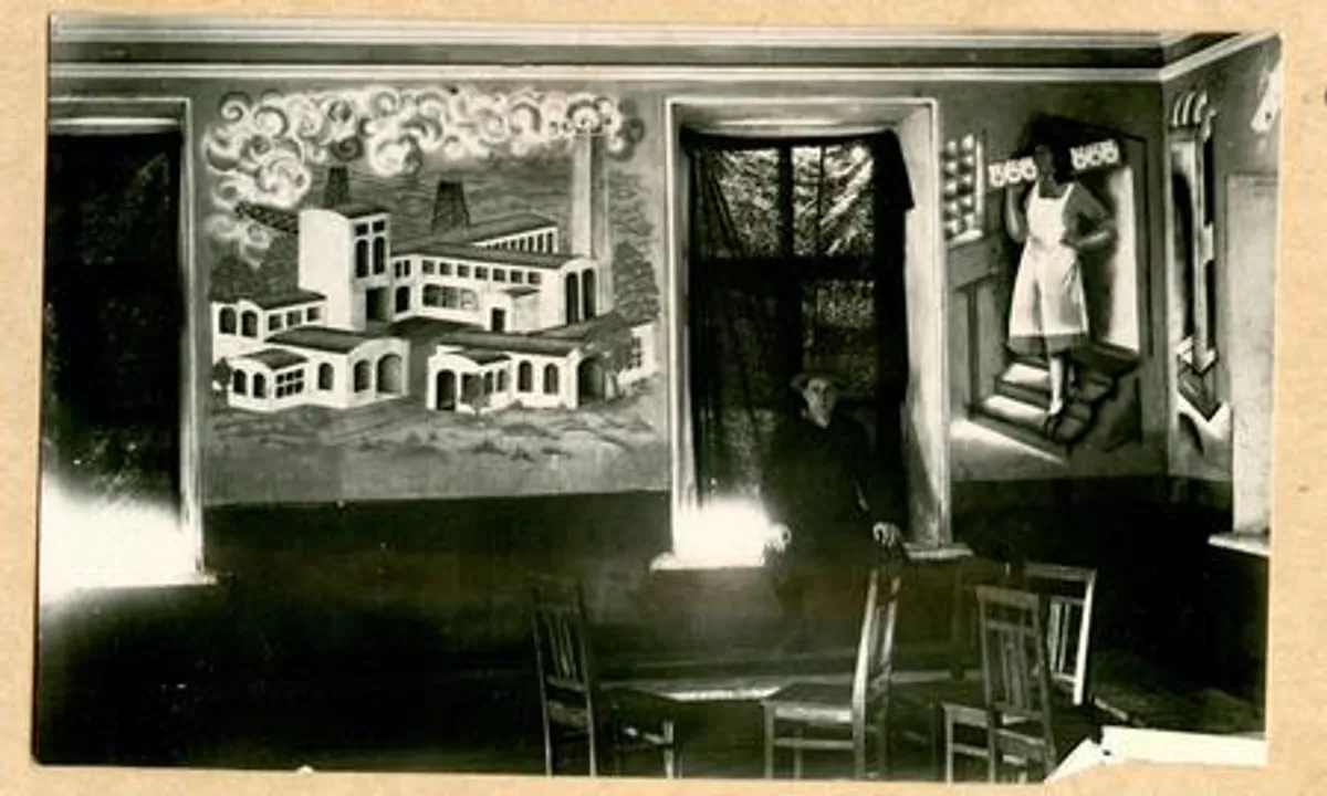 Михайло Бойчук на тлі невідомого монументального мурала