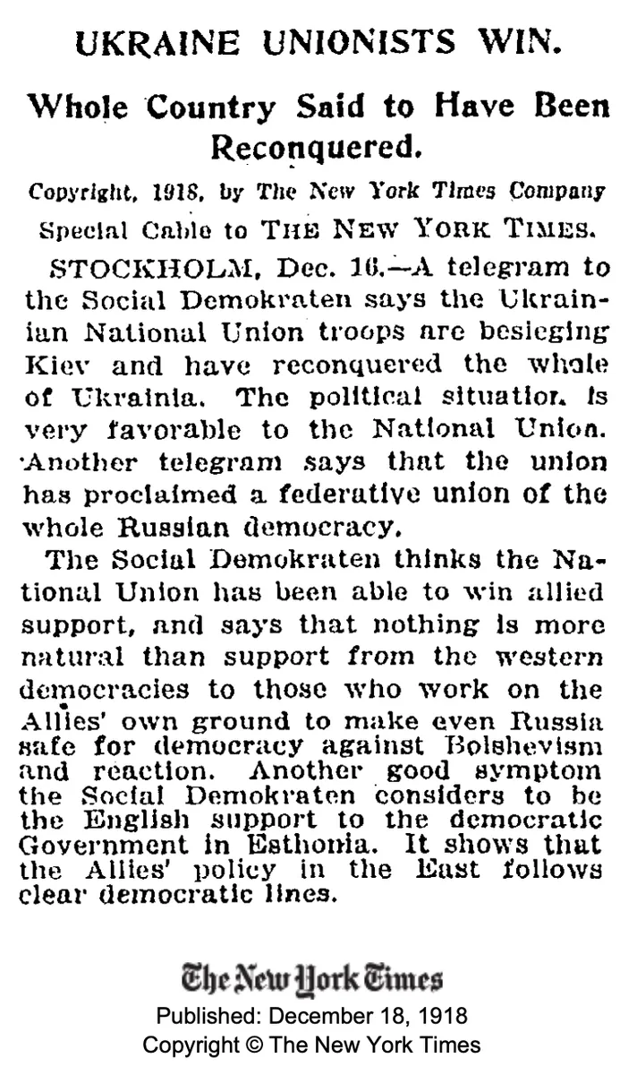 СТОКГОЛЬМ, 17 грудня. — У телеграмі до Соціал-демократів повідомляється, що війська Українського національного союзу облягають Київ і відвоювали всю Україну. Політична ситуація скрізь, як кажуть, сприятлива для Національного союзу. В іншій телеграмі йдеться, що союз проголосив федеративний союз усієї російської демократії. Соціал-демократи зазначають, що Український національний союз має на своєму боці симпатії та підтримку союзників. У ньому йдеться про надзвичайно важливе значення докладання всіх зусиль для підтримки тих, хто працює за демократію та проти більшовизму. Газета також вказує на підтримку Англією демократичного уряду в Естонії та робить висновок, що політика союзників на Сході повністю відповідає чітким демократичним принципам. Опубліковано: 18 грудня 1918 р. The New York Times. Авторське право © The New York Times.