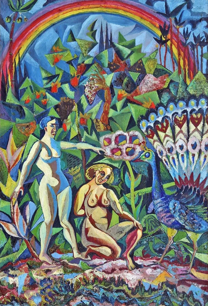Вишневий вітерНа картині зображено дві фігури в яскравому, візерунчастому антуражі, що характерно для зосередженості художника на повсякденному житті та українській культурі.