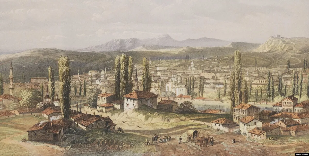 Робота зображує мальовничий вид міста Карасубазар (нині Білогірськ) у Кавказькому регіоні, з акцентом на вируючу діяльність та яскраву культуру цього регіону у 19 столітті. Місто було важливим центром Кримського ханства. Картина відображає загальний вигляд міста, показуючи його будівлі та навколишній ландшафт з пагорбами та горами.