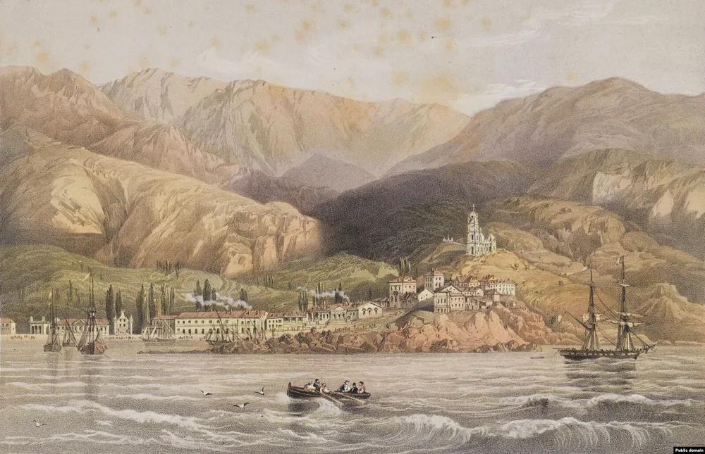 На художній роботі зображено вид на південнокримське місто Ялта з моря, місто розташоване в долині з церквою на пагорбі, оточене горами. На передньому плані на воді розташовані два веслові човни, а в затоці стоять на якорі більші вітрильні кораблі.