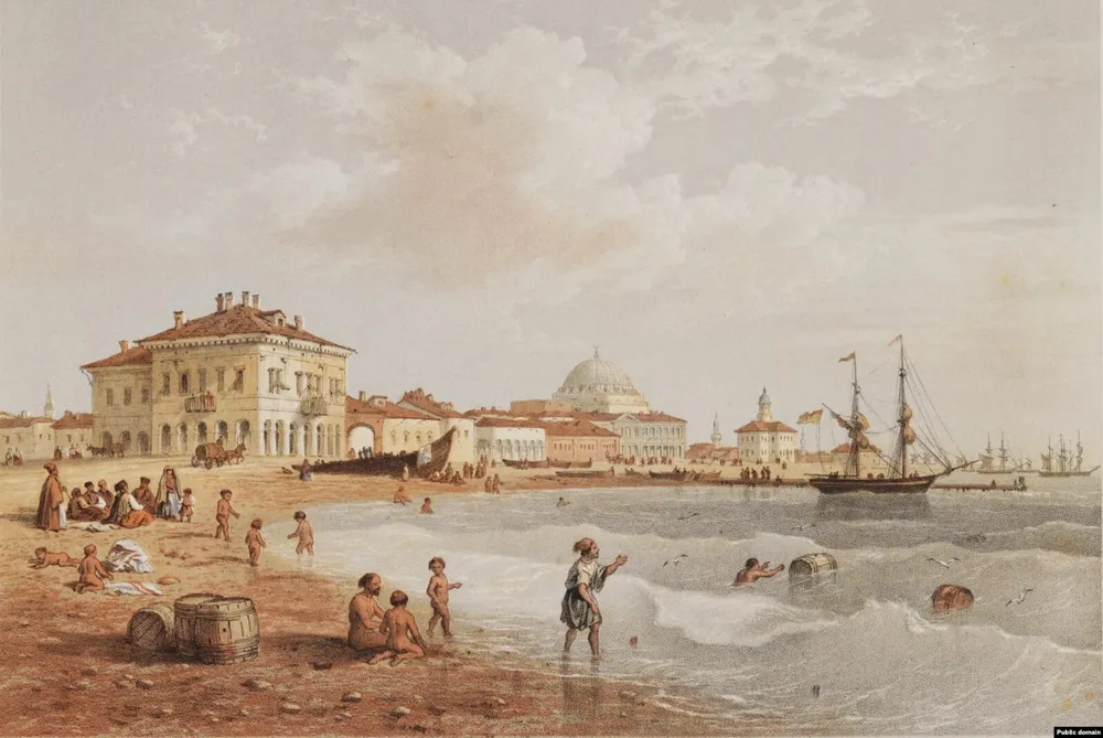 На роботі зображено мирний пляжний пейзаж у західному Криму. Ця картина є однією з 52 ілюстрацій Кримського півострова, створених художником, і була опублікована в книзі під назвою «Прекрасні пейзажі та головні визначні місця Криму». На ній зображено жвавий пляж із будівлями, що вишикувалися вздовж берега, зокрема мечеть з куполоподібним дахом та видатну білу будівлю з колонним фасадом. Люди та діти граються на піску та мілководді, а кілька вітрильних кораблів стоять на якорі в затоці.