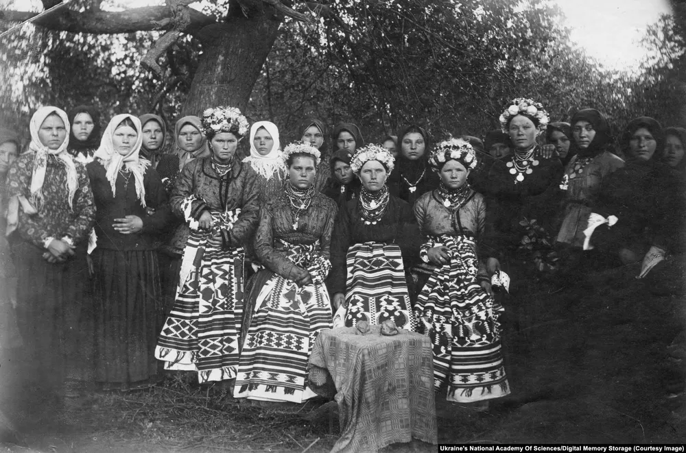 Жінки та дівчата, можливо, одягнені для святкування весілля, на Павлоградщині в Україні в 1909 році