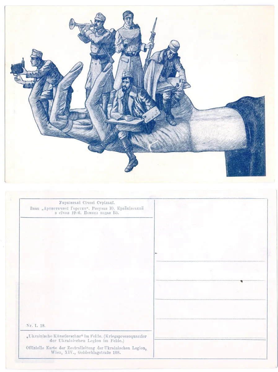 Поштівка Воєнної пресової квартири УСС (kriegspressequartier der Ukrainischen Legion im Felde) із серії Українські Січові Стрільці - Знак "Артистичної Горстки" авторства Ю.Крайківського в січні 1916 р. Помисл подав Бб.