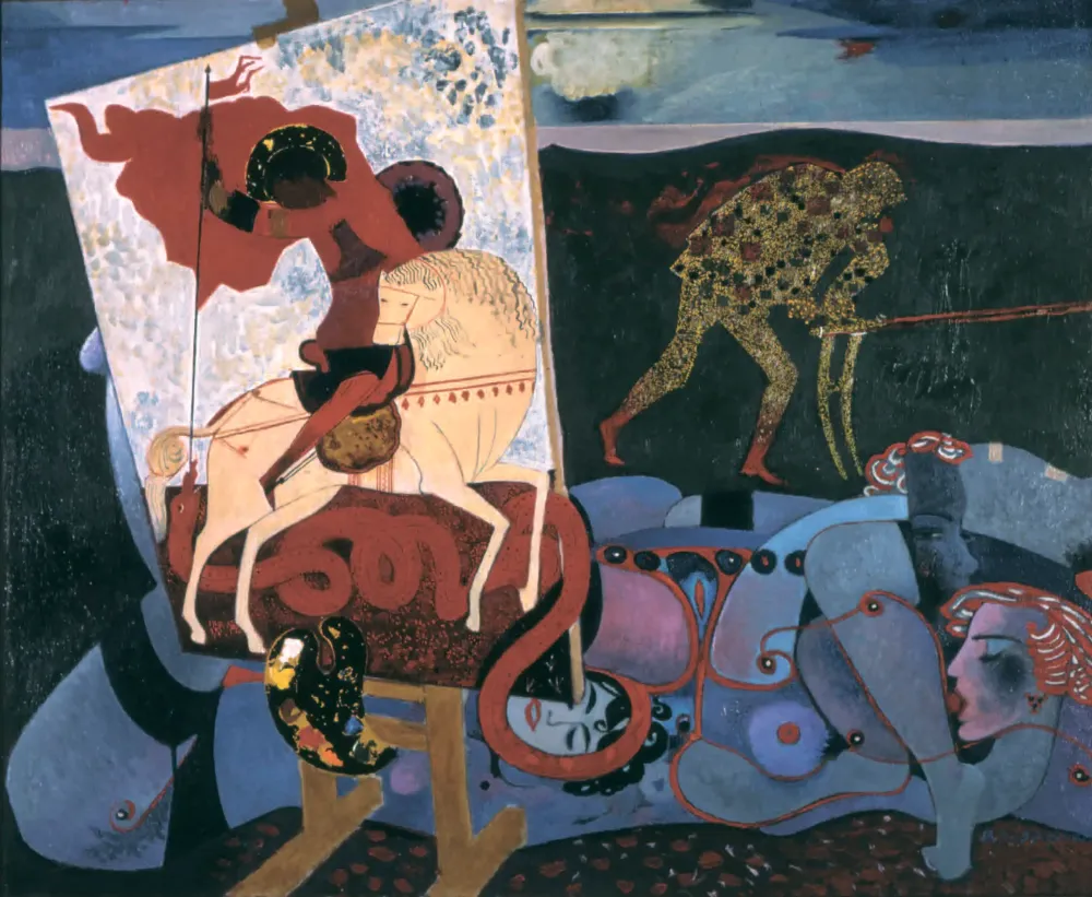 Cherry WindThe painting depicts two figures in a vibrant, patterned setting, characteristic of the artist's focus on everyday life and Ukrainian culture.