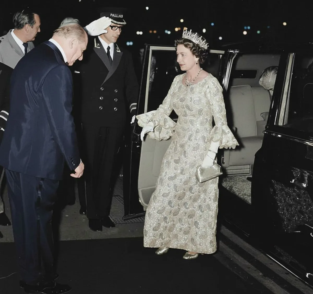 Her Majesty Queen Elizabeth II, is greeted by Media mogul Lew Grade (left), as she arrives at the Royal Gala Variety Performance at the London Palladium in aid of the British Olympics Appeal Fund. © Mirrorpix