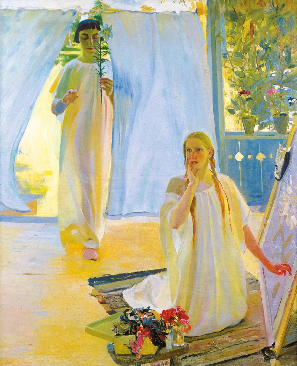 Cherry WindThe painting depicts two figures in a vibrant, patterned setting, characteristic of the artist's focus on everyday life and Ukrainian culture.