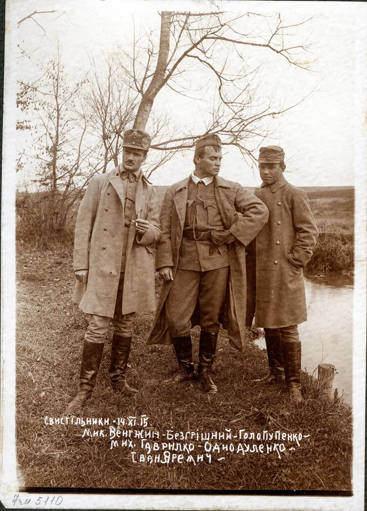 Varpalyanka, 5.03.1915. Place of settlement of the Cadre of the Ukrainian Sich. Riflemen. M. Yatsenovich, senior des., Rom. Pry(bilevich), senior des., T. Slobodyan, Nimchuk Pavlo, Petro Klyus. Volodymyr Sendetsky