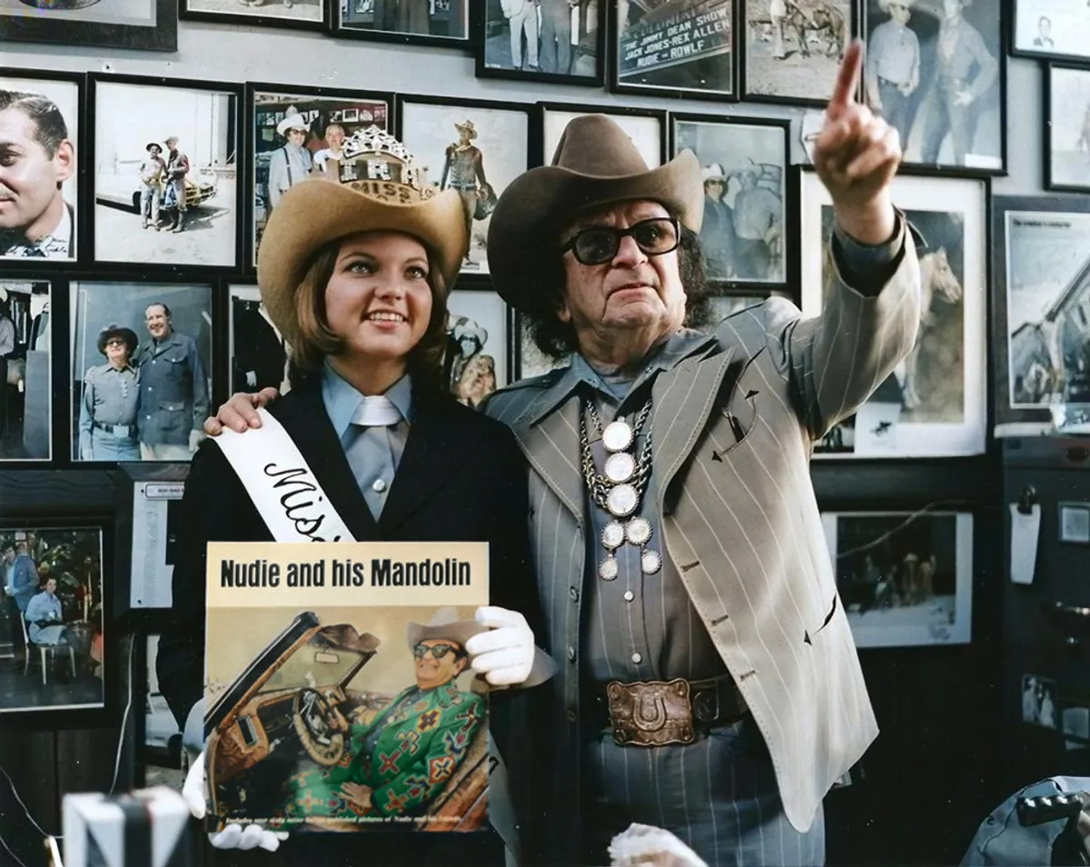 Nudie Cohn in his store with "Nudie and his Mandolin" vinyl