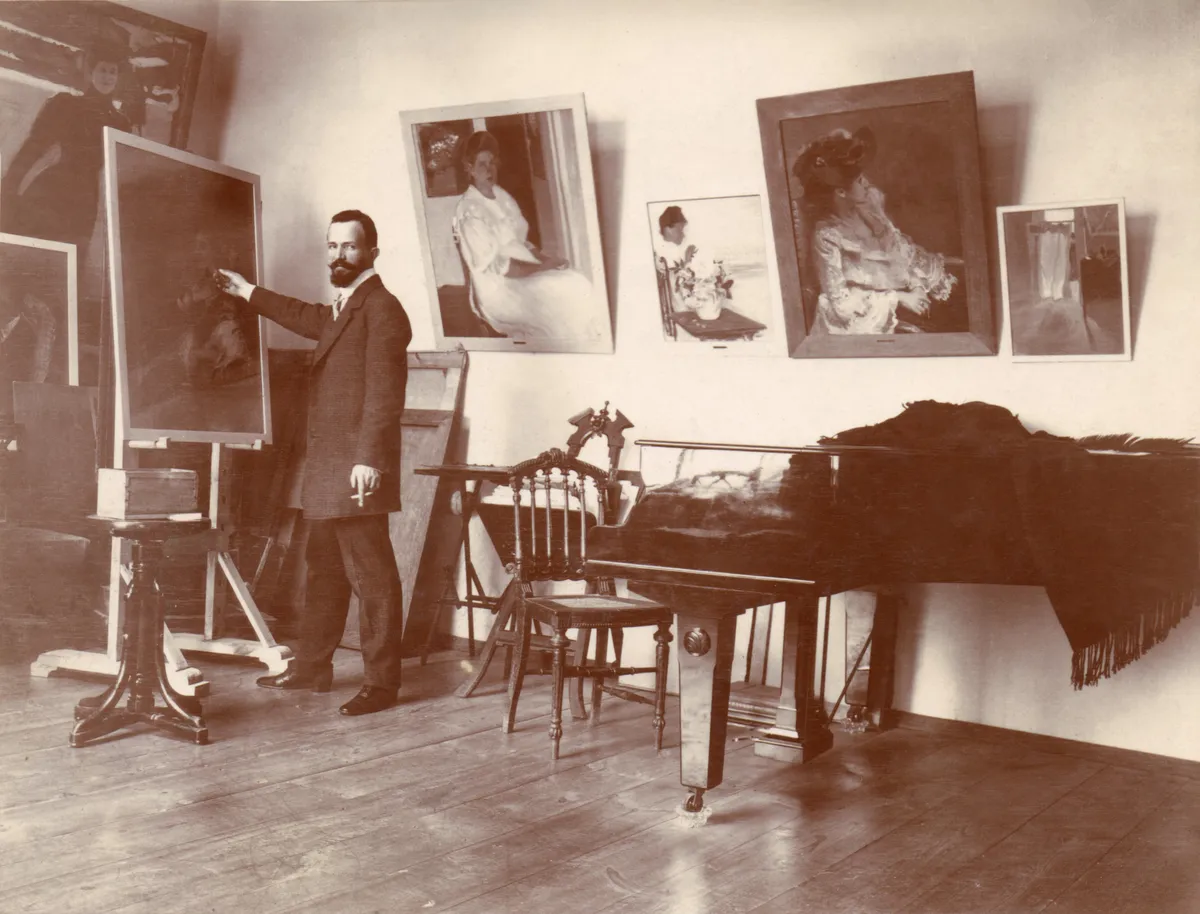 A photo of Mykhailo Boychuk in the studio with an unknown work
