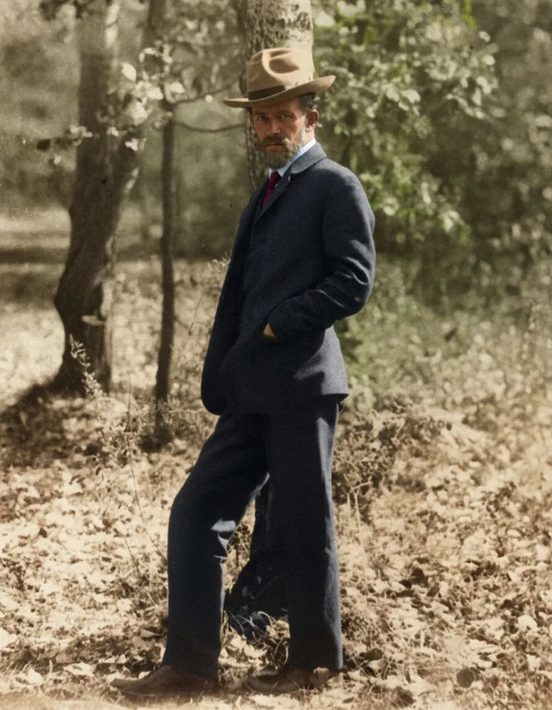 Living Echo of the Cossack Elite: Georgiy Narbut in Paraska Apostol’s Kontusz with Kelep and Colonel MiloradovychIn the photograph, Georgiy Narbut stands in the Cossack hall of the Tarnovsky Museum (now a room of the Chernihiv Regional Library for Youth), fully immersed in a historical Ukrainian image. He is dressed in the kontusz of Paraska Apostol, daughter of Hetman Danylo Apostol, holding a kelep in his right hand, while to his right stands Colonel Mykhailo “Cannon” Miloradovych. This staged yet documentary scene shows Narbut not just studying Cossack-era artifacts, but literally wearing them, turning himself into a living embodiment of the Ukrainian noble-Cossack past.