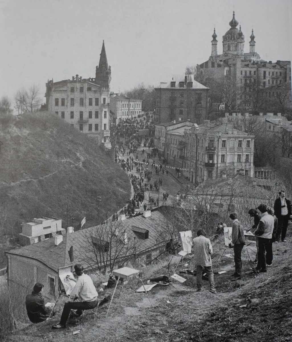 Student painters in the open air on the slope of Zamkova Hora above Andriivskyi Uzviz