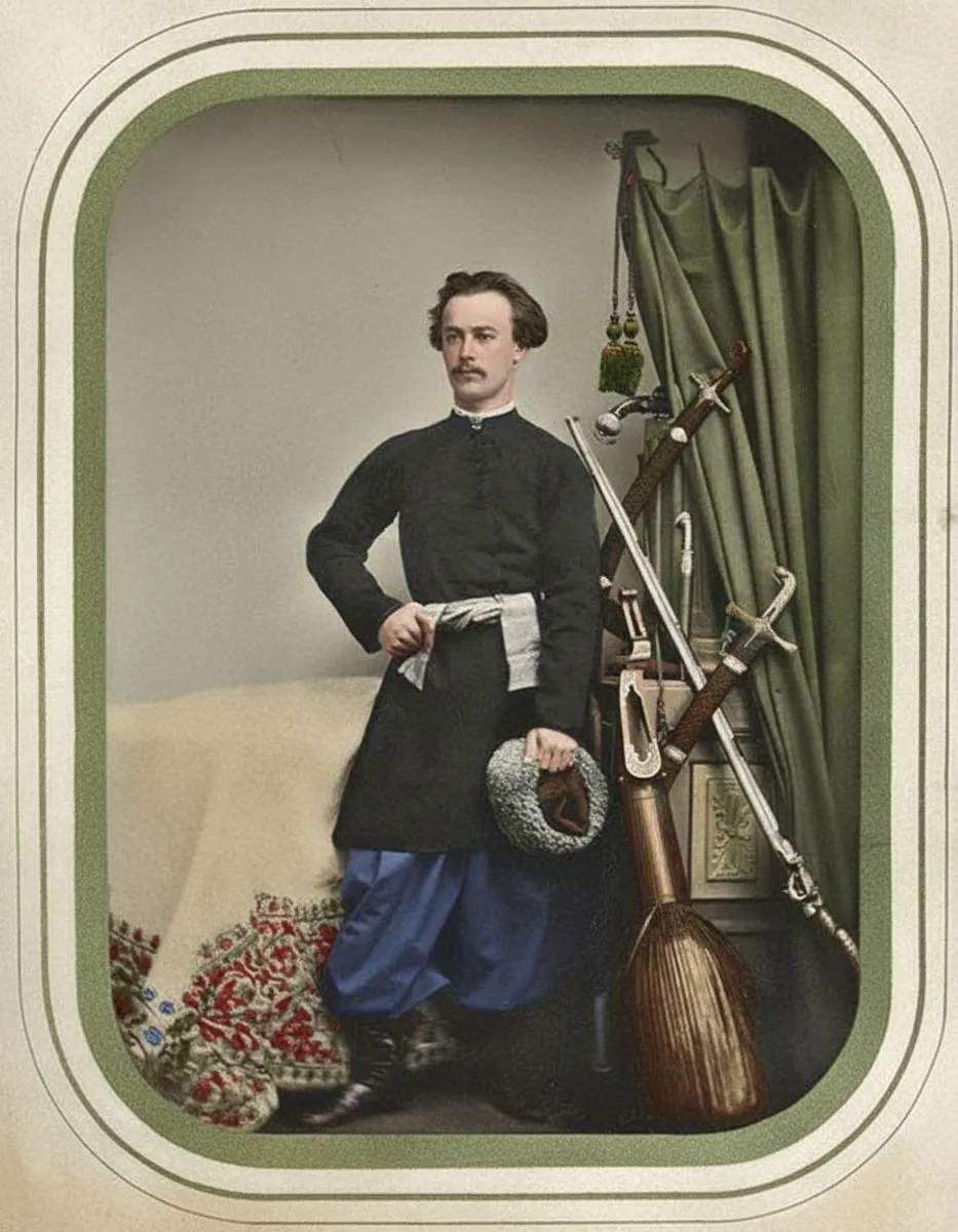 Living Echo of the Cossack Elite: Georgiy Narbut in Paraska Apostol’s Kontusz with Kelep and Colonel MiloradovychIn the photograph, Georgiy Narbut stands in the Cossack hall of the Tarnovsky Museum (now a room of the Chernihiv Regional Library for Youth), fully immersed in a historical Ukrainian image. He is dressed in the kontusz of Paraska Apostol, daughter of Hetman Danylo Apostol, holding a kelep in his right hand, while to his right stands Colonel Mykhailo “Cannon” Miloradovych. This staged yet documentary scene shows Narbut not just studying Cossack-era artifacts, but literally wearing them, turning himself into a living embodiment of the Ukrainian noble-Cossack past.